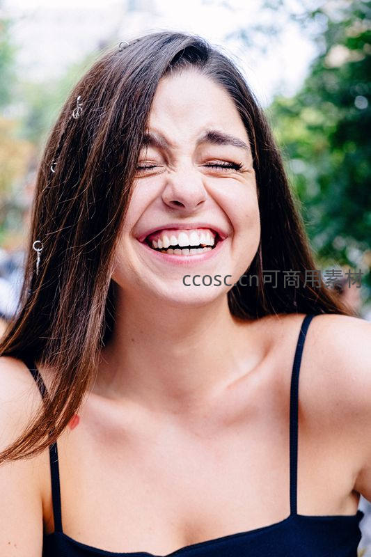 一位长发女子在户外阳光下尽情大笑,眼睛眯起,露出洁白牙齿,发间别着小巧发夹,传递出自由奔放、毫无顾忌的快乐情绪。