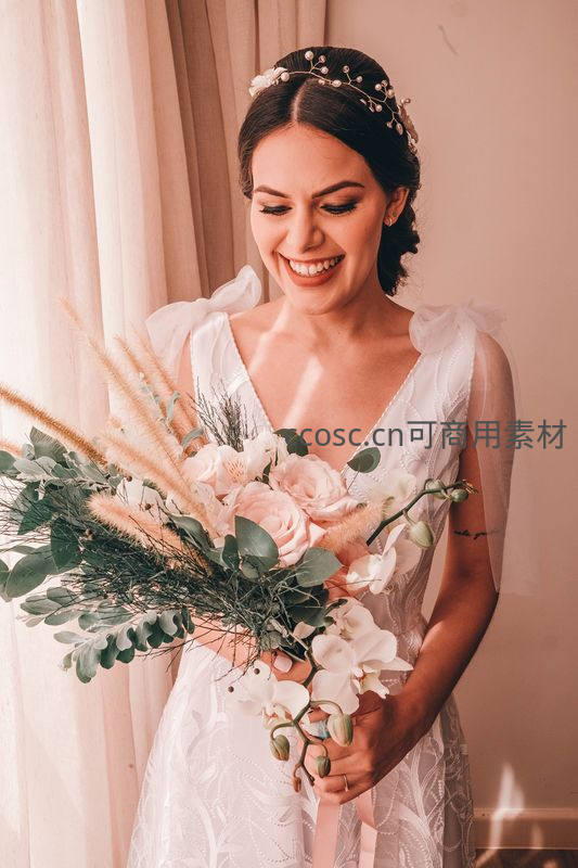 一位身穿白色蕾丝婚纱的新娘,面带灿烂笑容,手捧由玫瑰与绿叶组成的花束,头戴珍珠花环,背景柔和温馨。