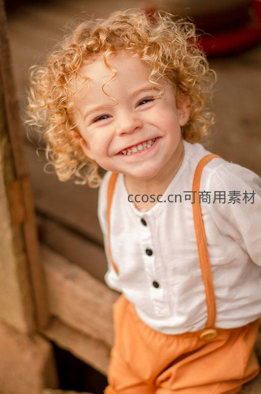 一个有着金色卷发的小孩穿着白色上衣和橙色背带裤,对着镜头露出天真无邪的笑容,背景虚化突出孩子纯净的快乐瞬间。
