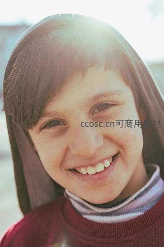 一个戴着眼镜的男孩在阳光下露出灿烂的笑容,光线从头顶洒下形成光晕效果,他穿着条纹高领衫,眼神明亮,充满童真与喜悦。
