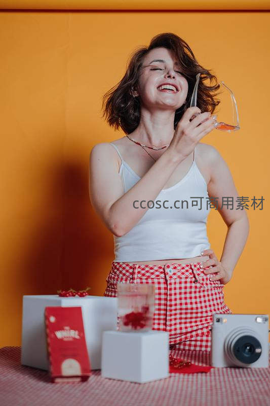 女子在明亮橙色背景前举杯畅饮,笑容灿烂,身旁摆放相机与小食,营造轻松惬意的生活场景,传递享受当下的愉悦心情。