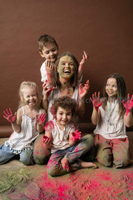 母亲与四个孩子在室内玩彩粉游戏,脸上和手上沾满彩色粉末,笑容灿烂,展现无拘无束的亲子欢乐时光。