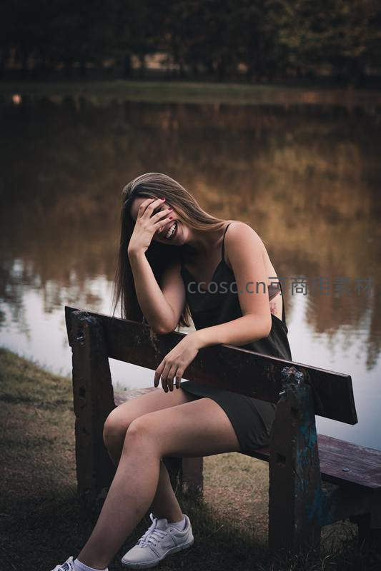 一位年轻女子坐在湖畔的旧木长椅上,捂嘴开怀大笑,背景是平静的水面与树林,传递出轻松自在的生活气息。