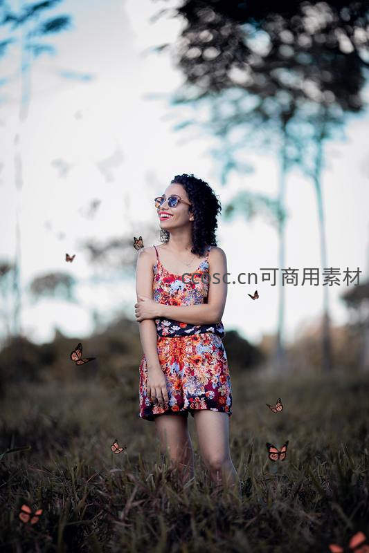 一位穿着碎花连衣裙的卷发少女站在田野里,微笑着仰望天空,身边环绕着翩翩起舞的蝴蝶,背景是朦胧的树林,画面充满诗意与生机。