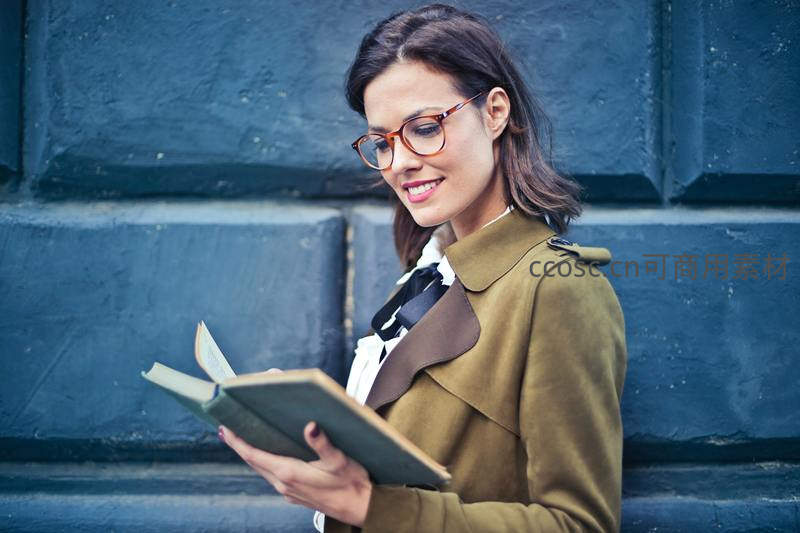 戴眼镜女子倚墙专注阅读旧书