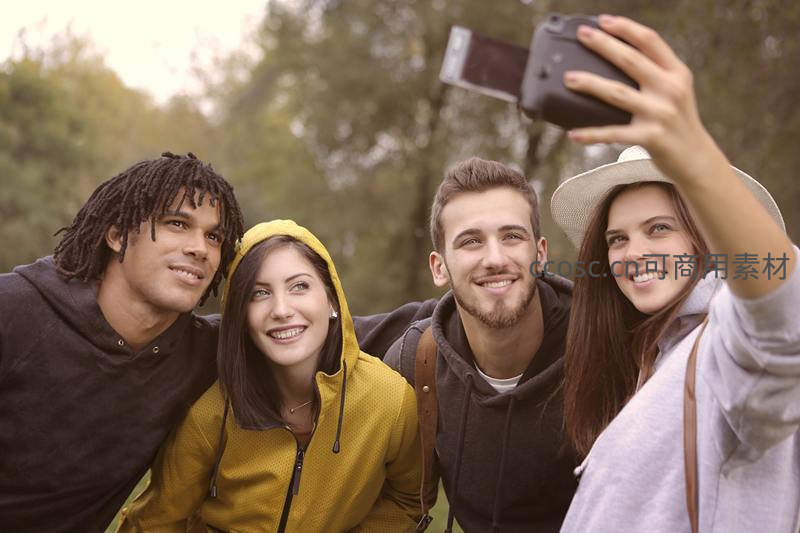 四位年轻朋友在公园绿树下亲密合影,其中一人高举手机自拍,大家笑容满面,展现了青春活力与友谊的美好时刻。