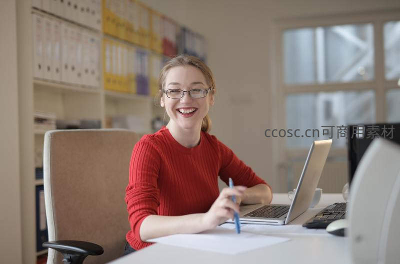 一位戴眼镜的女性坐在办公桌前,身穿红色针织衫,手握蓝色笔准备书写,面前放着笔记本电脑和文件,脸上洋溢着满足的笑容。
