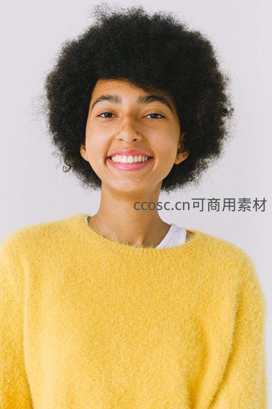 一位拥有浓密蓬松黑色卷发的年轻女性,身穿一件柔软的黄色毛衣,对着镜头绽放出洁白灿烂的笑容,眼神明亮,展现出自信、阳光和清新的气质。