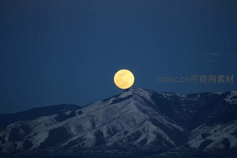 一轮金黄的满月恰好位于雪覆山峰之顶,深蓝夜空下,山峦轮廓清晰,营造出静谧而壮丽的自然奇观。