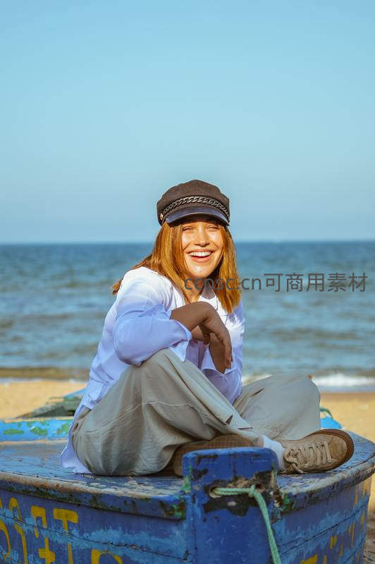 一位红发女子坐在蓝色旧渔船船头,身穿白衬衫和卡其裤,戴着帽子,对着镜头开怀大笑,身后是无垠的碧海蓝天,尽显海边度假的快乐时光。