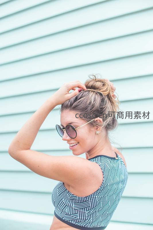时尚女郎整理发髻,墨镜遮阳尽显都市风情