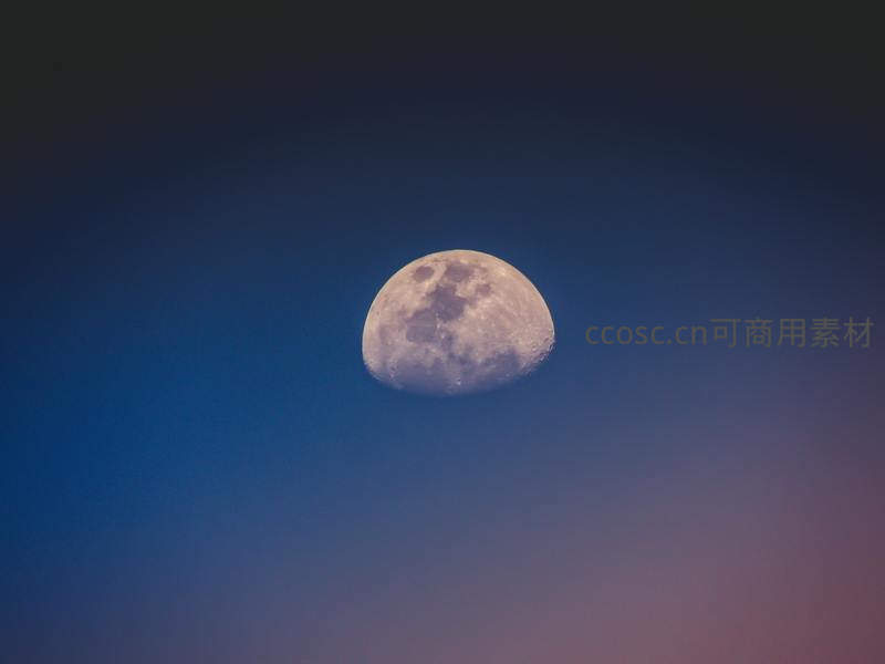 半轮皎洁的月亮悬于渐变的暮色天幕,柔和的光线与淡紫霞光交融,展现宇宙静谧而诗意的瞬间。