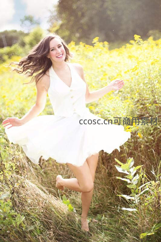 一位身穿白色连衣裙的女子在开满黄色野花的田野中欢快奔跑,长发飞扬,脸上洋溢着幸福的笑容,沐浴在温暖的阳光下。