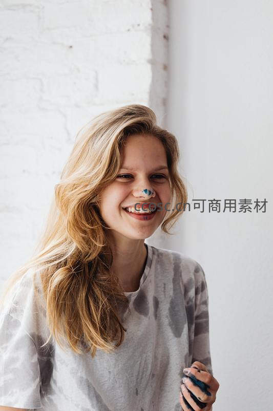 一位金发女子站在白色砖墙前,鼻尖点着蓝色颜料,手上也沾满色彩,她笑容灿烂,眼神明亮,展现出艺术创作后的满足与快乐,充满个性与活力。