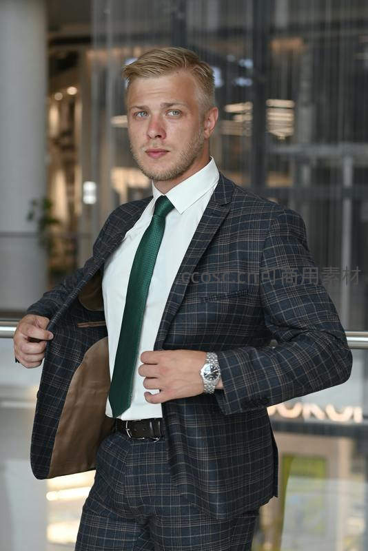 金发男士身穿深色格纹西装,搭配绿色领带和腕表,正整理衣襟,背景为现代建筑玻璃幕墙,尽显专业风范。