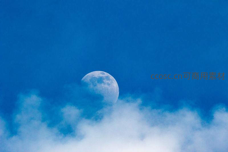 月亮半隐云层,蓝天如洗