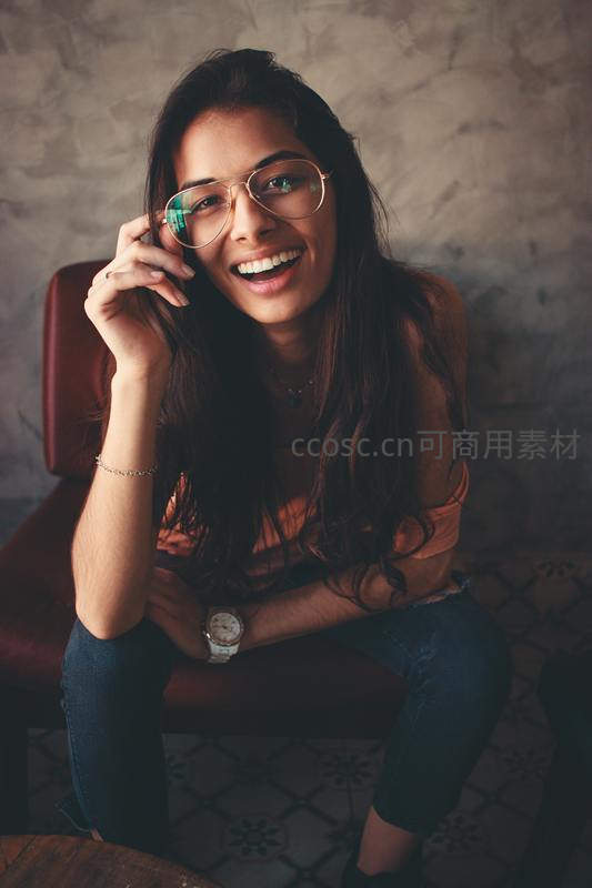 一位戴着眼镜的年轻女性坐在红色椅子上,开心地笑着,阳光透过窗户洒在她的脸上。她穿着橙色上衣和牛仔裤,展现出轻松愉悦的生活状态。