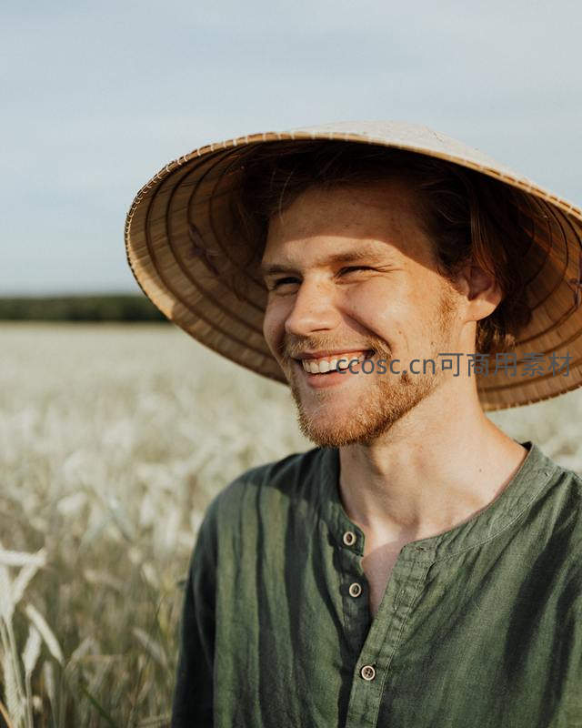 一位头戴传统斗笠的男子站在金黄麦田中,面带微笑望向远方,展现出丰收季节的宁静与满足感。