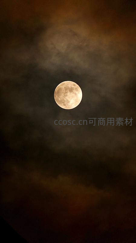 一轮金色的满月被流动的薄雾半遮半掩,光线穿透云层,在夜空中营造出神秘、幽静而梦幻的氛围。