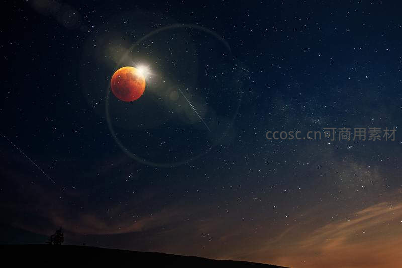 血月在璀璨星河中闪耀,镜头光晕与划过的流星为画面增添梦幻色彩,远处地平线透出微光。