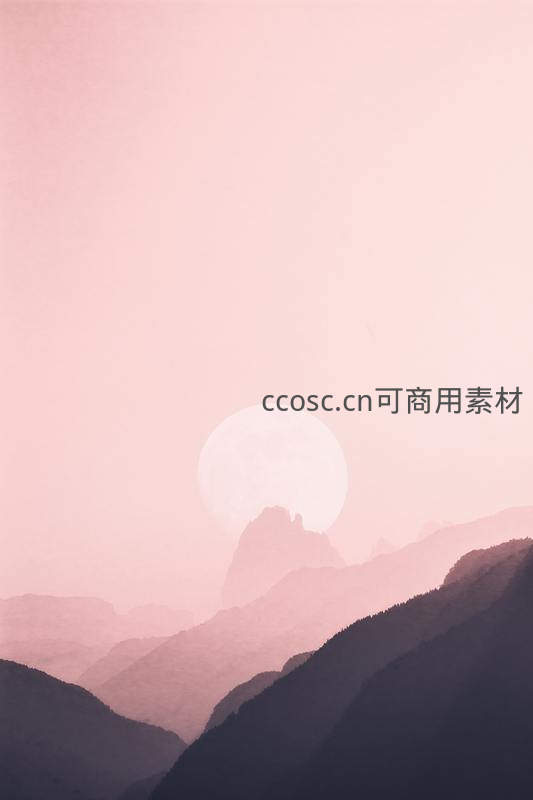 在一片柔和的粉红色薄雾笼罩下,连绵的山峦呈现出深色的剪影,一轮巨大的圆月在其后方若隐若现,画面充满诗意与宁静。