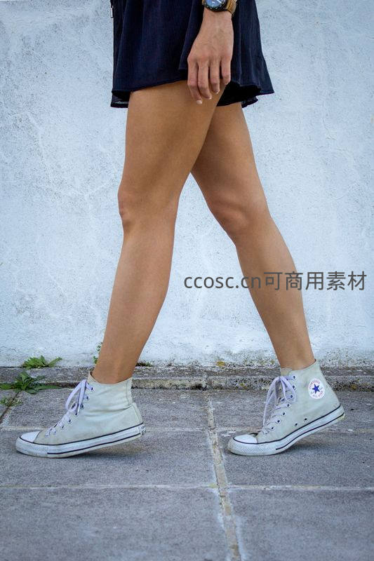 画面聚焦于一双穿着经典白色高帮帆布鞋的修长双腿,正迈步在石板路上,背景是斑驳的白墙,充满街头生活气息。