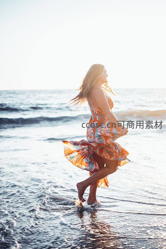 金色夕阳下,一位金发少女身着飘逸的橙色印花长裙,在海边浅水中欢快奔跑,裙摆随风舞动,溅起晶莹水花,尽显无拘无束的青春活力。