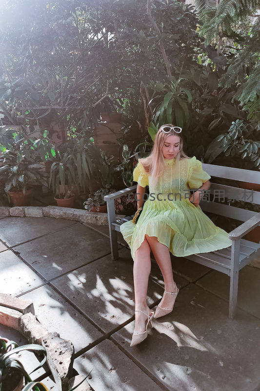 少女身着明黄色连衣裙,坐于庭院长椅,四周绿植环绕,阳光透过叶隙洒落,营造清新自然、惬意悠然的午后时光。