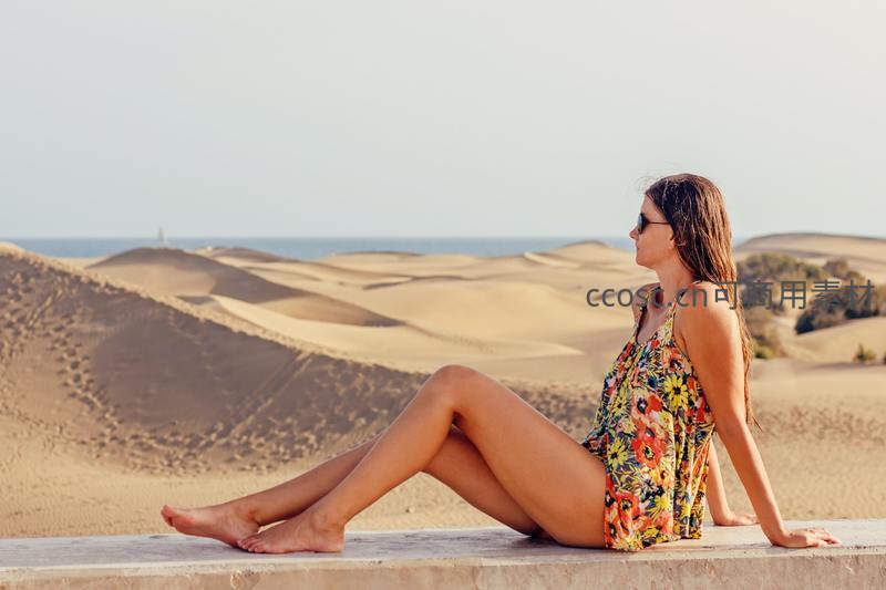 一位身穿花裙的女子坐在沙丘旁的石台上,背靠金色沙海,眺望远方的碧海蓝天,尽显度假风情。