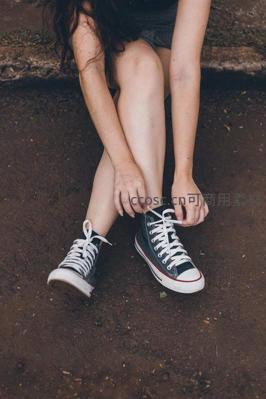 泥土路上系鞋带的帆布少女