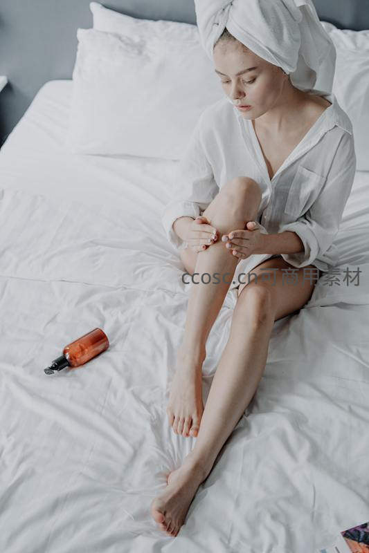 头裹浴巾的女子坐在洁白床单上,专注按摩腿部肌肤,身旁放置护肤瓶,展现沐浴后自我呵护的温馨时刻。