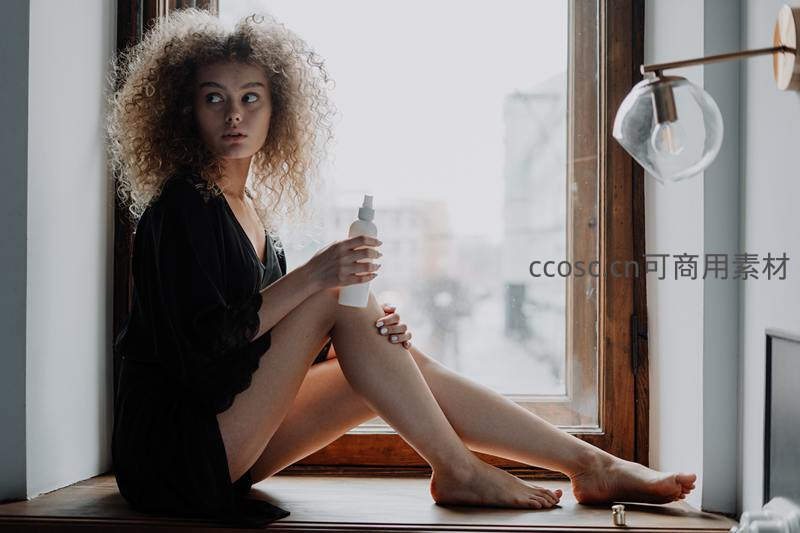 金发卷曲女子静坐窗前,手持喷雾瓶轻抚膝盖,眼神望向窗外,流露沉思与宁静,展现居家美肌时光。