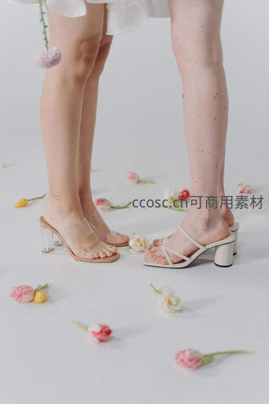 两位女士并肩站立,脚穿不同款式的时尚高跟凉鞋,脚下散落着粉色、黄色和白色的娇嫩花朵。纯白背景突显了鞋子的设计与腿部线条的美感。