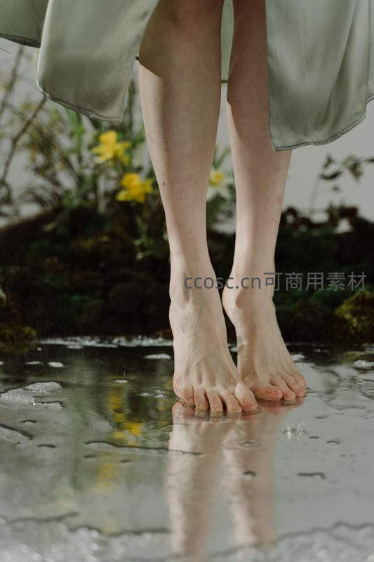 雨后的花园里,一位女子赤脚站在湿润的地面上,水洼清晰地映出她的小腿和背景中的绿色植物与黄色小花。画面充满自然气息与宁静的清新感。
