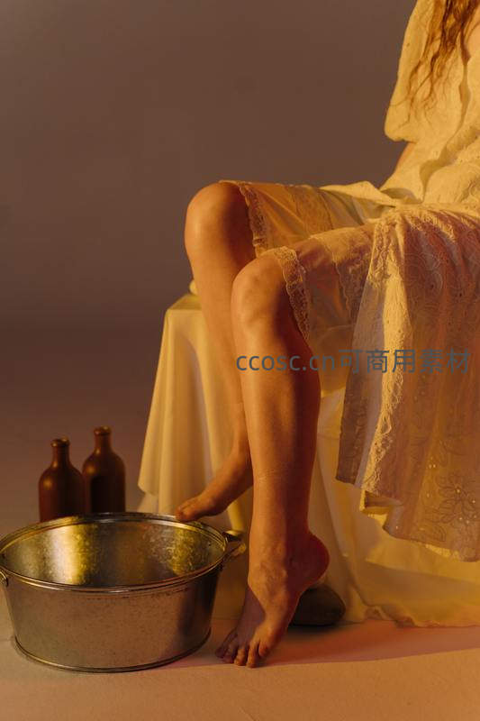 在柔和的暖色灯光下,一位穿着蕾丝裙的女子正准备将脚放入金属盆中,背景的棕色瓶子增添了复古的氛围感。