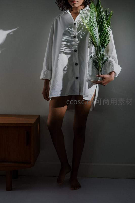 一位女性身着宽松白衬衫,手持玻璃瓶中的绿植,自然光透过叶片在衣物上投下斑驳影子,营造出宁静而富有艺术感的居家氛围。