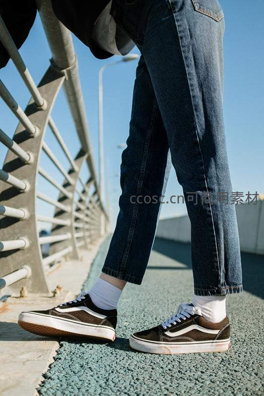 阳光明媚的桥面上,穿着深色牛仔裤和经典黑白帆布鞋的人低头站立,金属栏杆与蓝天构成背景,展现随性街头风格与都市活力。