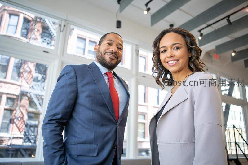 一男一女两位商务人士站在大窗前,面带自信微笑直视镜头,身后是城市建筑景观,象征团队协作与职业成功。