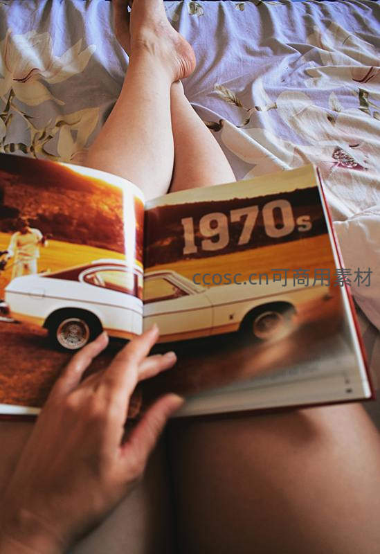 慵懒地躺在床上翻阅一本关于20世纪70年代经典汽车的画册,手轻抚书页,沉浸在复古美学与时光记忆中。