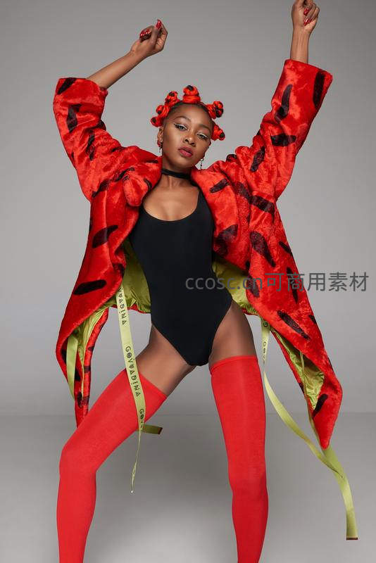 模特身着鲜艳红色印花外套与黑色紧身衣,搭配同色系过膝袜,摆出充满张力的动感姿势,尽显前卫时尚魅力。