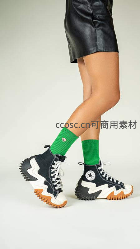 模特穿着黑色厚底帆布鞋和亮绿色长袜,搭配皮质短裙,展现出街头潮流与活力十足的时尚风格。