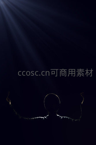 一个人在黑暗中静坐冥想,一束神圣的光线从天而降,照亮其轮廓,象征着内心的平静与精神的升华。