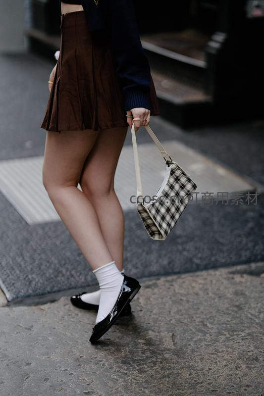 一位时尚女孩走在街头,身穿深棕色百褶短裙、深色针织衫与白色中筒袜,搭配黑色漆皮乐福鞋,手提一款黑白格纹小包,整体造型复古又摩登。
