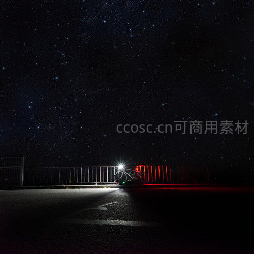 一辆单车停驻在星光璀璨的夜路旁,车灯划破黑暗,红色尾灯与漫天星辰形成冷暖对比,充满孤独与探索感。