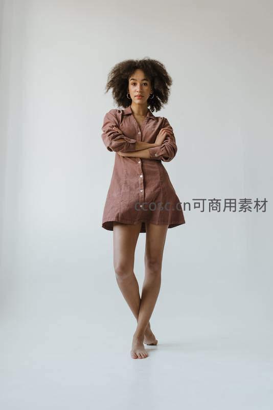 一位卷发女子身着棕红色衬衫裙,双臂交叉站立于纯白背景下,眼神坚定,展现出独立与从容的气质。
