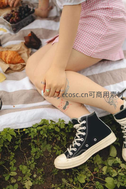 野餐少女腿上纹身与帆布鞋