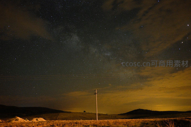 广袤田野上孤零零的电线杆伫立在银河之下,远处黄光晕染云层,营造出一种苍茫、宁静又略带寂寥的夜色意境。