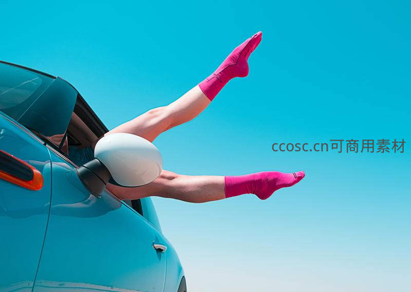 一双穿着亮粉色袜子的修长美腿从蓝色汽车车窗伸出,背景是无垠的蔚蓝天空,充满旅行的自由与活力。