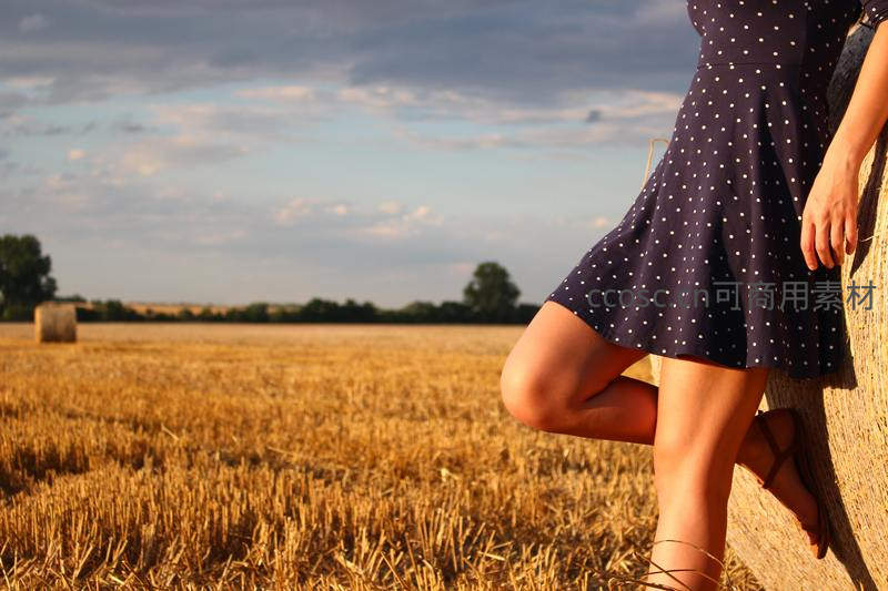 一位身穿深蓝色波点连衣裙的少女倚靠在草垛旁,金色的麦田在夕阳下铺展至天际,构成一幅宁静而唯美的田园画卷。