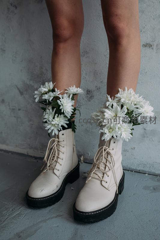 一双米白色的厚底系带军靴中,被巧妙地插入了两束洁白的雏菊,花朵从靴筒中探出,与冷硬的靴子形成鲜明对比,展现了柔美与力量交融的独特时尚感。
